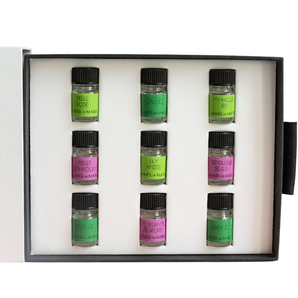 Entdecken Sie die Welt der 100 % natürlichen Parfums von Aimée de Mars mit diesem raffinierten Entdeckungsset. Es enthält 9 Mini-Fläschchen (2 ml) mit den 3 Bestsellern aus jeder unserer Kollektionen: Déesses, Originelle und Mixte Masculin.