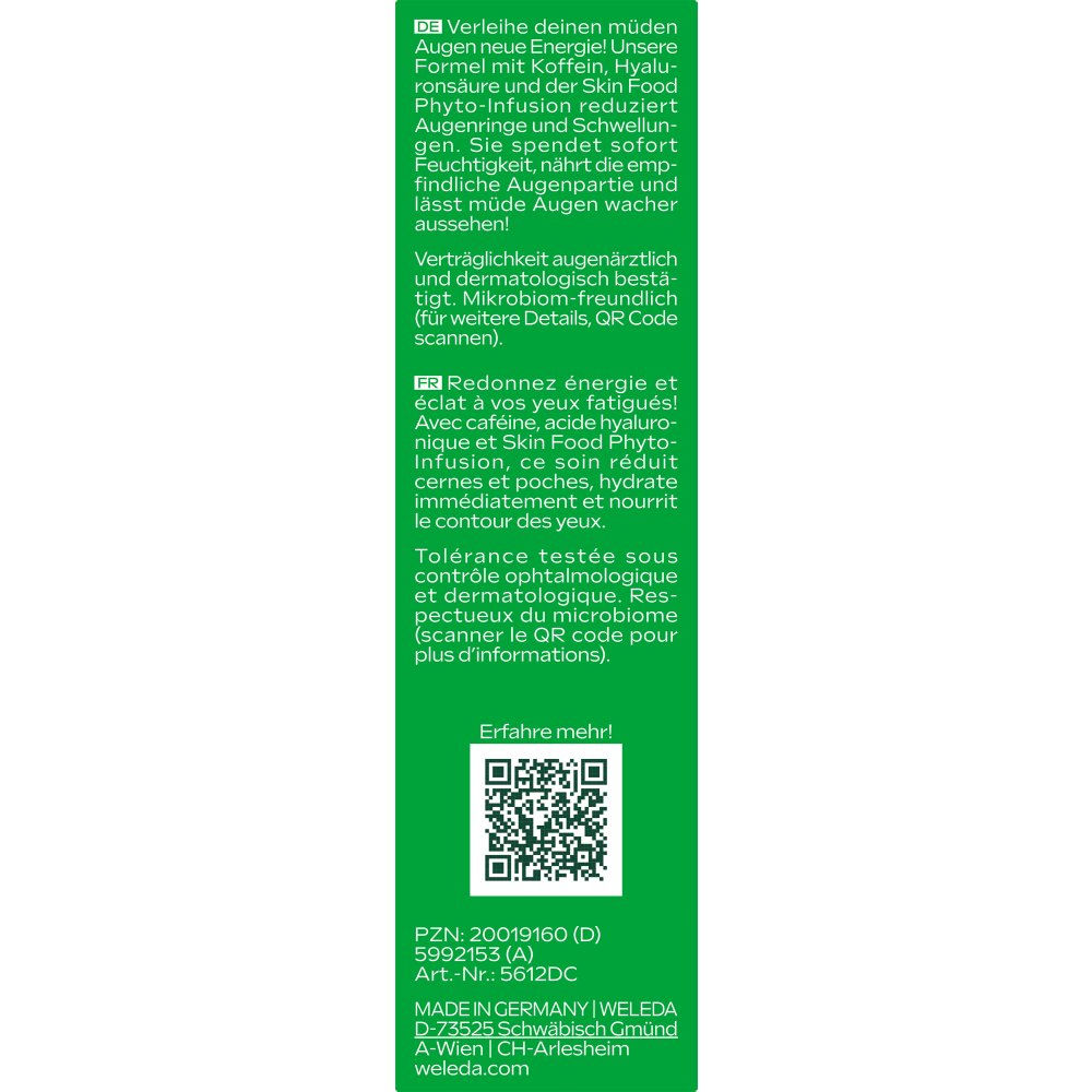 Super oční krém Skin Food s kofeinem, kyselinou hyaluronovou a výživnou fytoinfuzí dodává unaveným očím novou energii. Jemné složení redukuje tmavé kruhy a otoky, intenzivně hydratuje a posiluje citlivé oční okolí. Oftalmologicky a dermatologicky testováno, zajišťuje probuzený a svěží pohled.