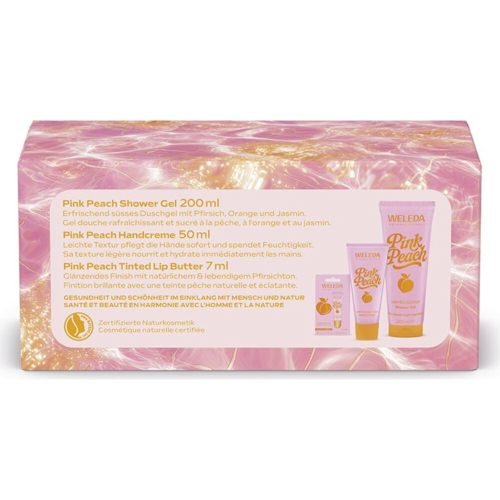 Das WELEDA Set Pink Peach ist Sommer, Pink Peach ist Pink, Pink Peach ist eine sonnenverwöhnte Sinnesreise voll fruchtig frischem Charme. Das Set ist die perfekte Kombination aus Dusche, Handcreme & Lip Butter.