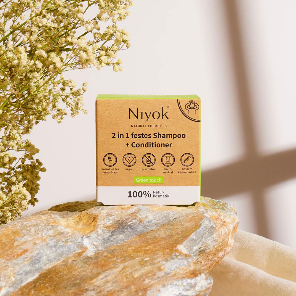 S pevným šamponem 2 v 1 od společnosti Niyok dostanou náročné vlasy přesně tu péči, kterou nutně potřebují. Speciální složení nejprve vlasy očistí a odstraní z pokožky hlavy přebytečný maz a další nečistoty. Složení zároveň působí i jako kondicionér, který vlasy hydratuje a vyživuje až ke konečkům. Vlasy jsou tak mnohem jemnější, snadněji se rozčesávají a získávají větší objem. Tuhý šampon má hodnotu pH 5,5, a je proto obzvláště šetrný k pokožce hlavy. Po použití zanechává ve vlasech letní vůni, která je charakteristická pro řadu Green Touch od značky Niyok. Obzvláště intenzivní jsou vonné tóny kardamomu a mimózy. Pevná struktura šamponu se sice rozvine v jemnou pěnu, ale zároveň zaujme kvalitním zpracováním a dlouhou životností bez lámání. Jako veganská kosmetika bez plastů a s certifikátem přírodní kosmetiky se vyrábí v Německu, a je tak symbolem udržitelnosti a minimalistického životního stylu.