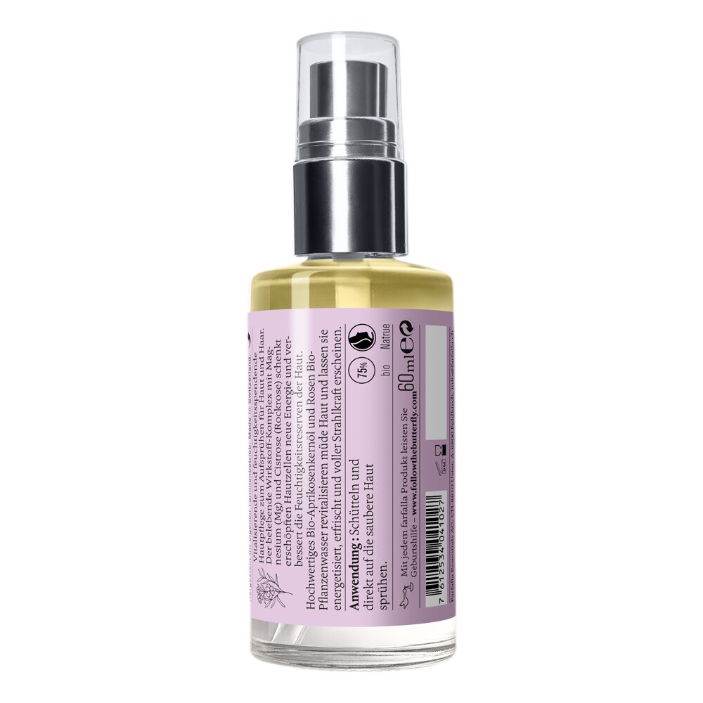 VAND, VEGETABILSK SQUALANE, ROSENVAND*, PENTYLENGLYCOL (VEGETABILSK), ABRIKOSKERNEOLIE*, JOJOBAOLIE*, MAGNESIUMSULFAT, ALOE VERA JUICE*, VEGETABILSK GLYCERIN, MAGNESIUMSULFAT, BLANDING AF NATURLIGE ÆTERISKE OLIER, NATURLIGT E-VITAMIN, SOLSIKKEOLIE, XANTHANGUMMI, HYALURONSYRE, RADISERODSEKSTRAKT, ÆTERISK CISTUSOLIE*, CITRONSYRE. * fra kontrolleret økologisk dyrkning.