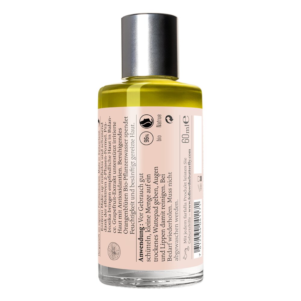 Le démaquillant 2 phases au pamplemousse Prebio élimine en douceur et en profondeur même le maquillage le plus tenace, sans assécher la peau. La formule innovante à deux phases combine un nettoyage doux et un soin nourrissant. L'eau de fleur d'oranger hydrate, tandis que l'extrait de pamplemousse a un effet antioxydant et protège la peau contre les agressions extérieures. Les prébiotiques renforcent l'équilibre de la peau et soutiennent sa barrière protectrice naturelle. Pour une sensation de peau soignée et fraîche - convient également aux peaux sensibles.