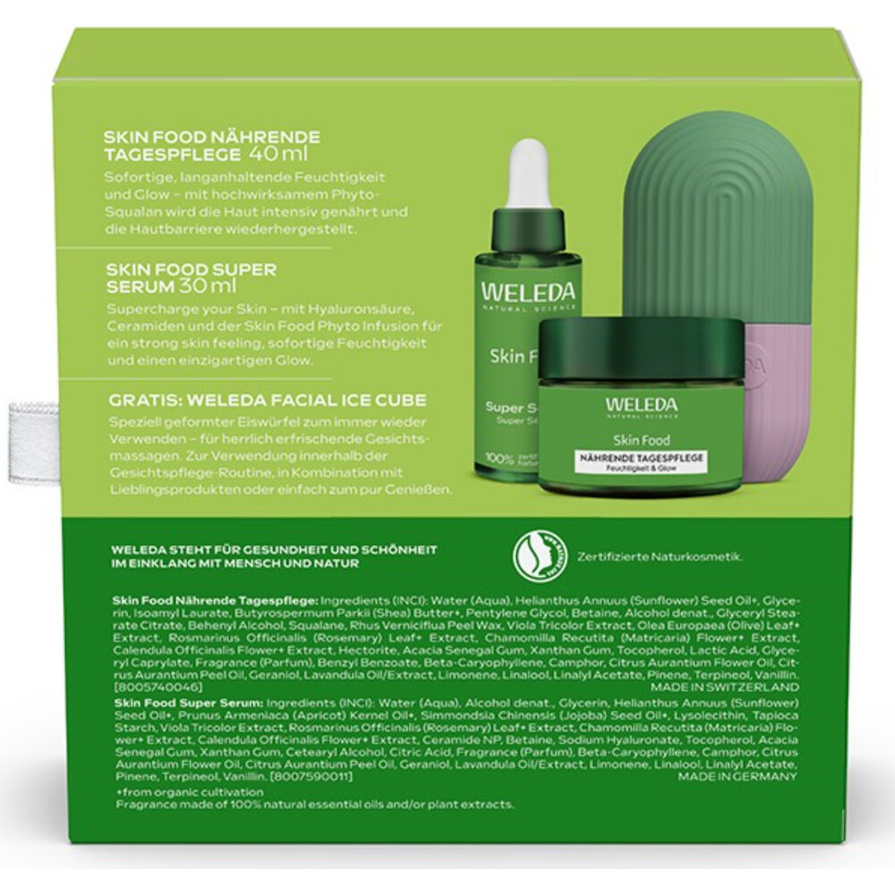 Das WELEDA Geschenkset eine Extraportion hochwirksame Pflege mit natürlichen Inhaltsstoffen. Das Geschenkset enthält den neuen Super Beauty Booster: Skin Food Super Serum 30ml und die Skin Food Nährende Tagespflege 40ml. Im Set enthalten ist der Weleda Facial Ice Cube GRATIS