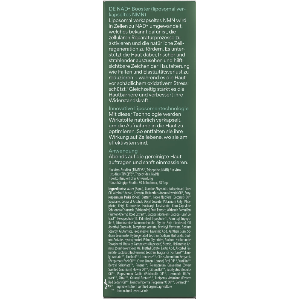 Water (Aqua), Crambe Abyssinica (Abyssinian) Seed Oil, Alcohol* denat., Glycerin, Helianthus Annuus Hybrid Oil*, Butyrospermum Parkii (Shea) Butter*, Cocos Nucifera (Coconut) Oil*, Squalane, Cetearyl Alcohol, Decyl Cocoate, Potassium Cetyl Phosphate, Cetyl Ricinoleate, Isostearyl Isostearate, Coco-Caprylate, Schisandra Chinensis (Schisandra) Fruit Extract, Withania Somnifera (Winter-Cherry) Root Extract*, Bacopa Monnieri (Bacopa) Leaf Extract*, Hexapeptide-11, Palmitoyl Tripeptide-1, Palmitoyl Tripeptide-5, Nicotinamide Mononucleotide, Glycine Soja (Soybean) Oil, Ascorbyl Glucoside, Tocopheryl Acetate, Myristyl Myristate, Sodium Stearoyl Glutamate, Propanediol, Levulinic Acid, Xanthan Gum, Sodium Levulinate, Hydrogenated Lecithin, Sodium Hydroxide, Sodium Anisate, Hydrogenated Palm Glycerides, Sodium Hyaluronate, Tocopherol, Brassica Campestris (Rapeseed) Sterols, Helianthus Annuus (Sunflower) Seed Oil, Triethyl Citrate, Lactic Acid, Ascorbyl Palmitate, Lactobacillus Ferment, Lecithin, Fragrance (Parfum)**, Linalyl Acetate**, Linalool**, Limonene**, Citrus Aurantium Bergamia (Bergamot) Peel Oil**, Citrus Limon (Lemon) Peel Oil**, Vanillin**, Benzyl Salicylate**, Pinene**, Pelargonium Graveolens (Sweet Scented Geranium) Flower Oil**, Citronellol**, Eucalyptus Globulus Oil**, Pogostemon Cablin (Patchouli) Oil**, Lavandula Oil/Extract**, Citral**, Geranyl Acetate**, Juniperus Virginiana (Eastern Red Cedar) Oil**, Mentha Piperita (Peppermint) Oil**, Geraniol** * ingredients from certified organic agriculture ** from natural essential oils