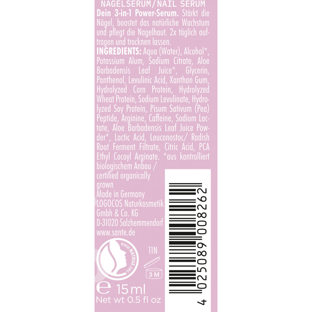 Stärkere Nägel in Rekordzeit verspricht das Sante Stronger Harder Longer Nails Serum. Die hochwirksame 3-in-1-Formel pflegt, kräftigt und fördert das natürliche Nagelwachstum. Bio-Aloe Vera und Panthenol spenden intensive Feuchtigkeit und beruhigen die empfindliche Nagelhaut. Peptide, pflanzliches Keratin, Arginin und Koffein stärken die Nagelstruktur und beugen Brüchigkeit vor. Das Resultat: sichtbar gepflegte, längere Nägel und eine geschmeidige Nagelhaut - wie frisch aus der Maniküre. Vegan und aus kontrolliert biologischem Anbau.