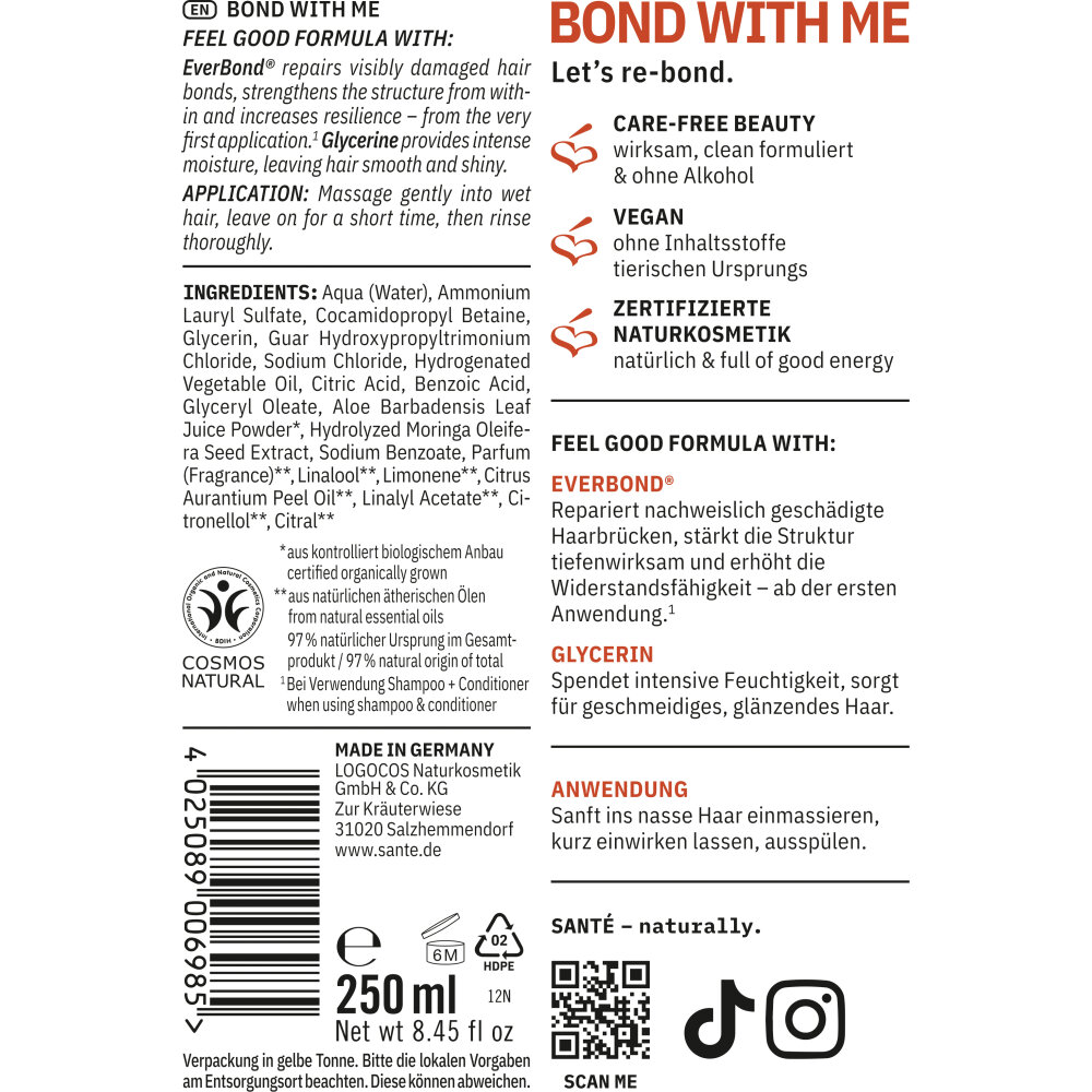 Verwöhne dein Haar mit dem Sante Bond With Me Shampoo und schenke ihm neue Stärke. Die sanft reinigende, vegane Formel mit EverBond™ repariert geschädigte Haarbrücken, stärkt die Struktur und spendet intensive Feuchtigkeit. Besonders strapaziertes, coloriertes oder hitzegestyltes Haar profitiert von der regenerierenden Pflege, die Glanz und Geschmeidigkeit zurückbringt. Beim Einmassieren verwandelt sich das Shampoo in einen cremigen Schaum, der schonend reinigt, ohne auszutrocknen. Zertifizierte Naturkosmetik nach COSMOS Natural Standard garantiert höchste Qualität und bewusste Pflege. Für sichtbar kräftigeres, glatteres und gesünder aussehendes Haar - Tag für Tag.