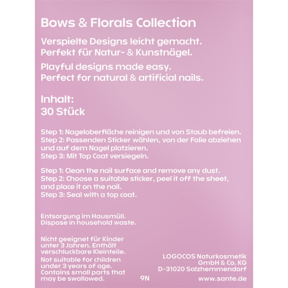 Kreative Nail-Art war noch nie so einfach wie mit dem Sante Nail Sticker Set. Die ultradünnen Sticker passen sich flexibel jeder Nagelform an und haften zuverlässig - egal ob auf Natur-, Lack- oder Kunstnägeln. Verspielte Designs mit Schleifen, floralen Details, Perlen und holografischem Glanz machen deine Nägel zu echten Hinguckern. Ganz ohne Aufwand erzielst du professionelle Ergebnisse und kannst deinen Look jederzeit verändern. Ideal für alle, die trendige Styles lieben und Wert auf unkomplizierte Anwendung legen.