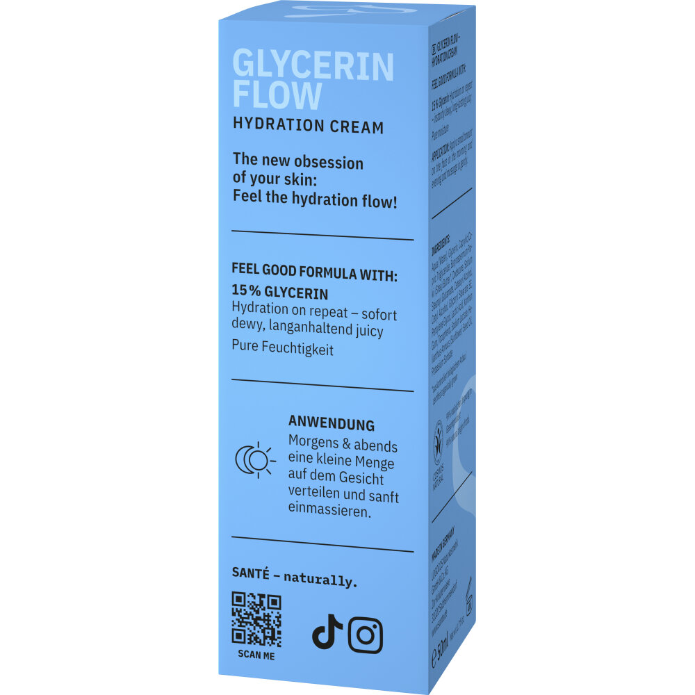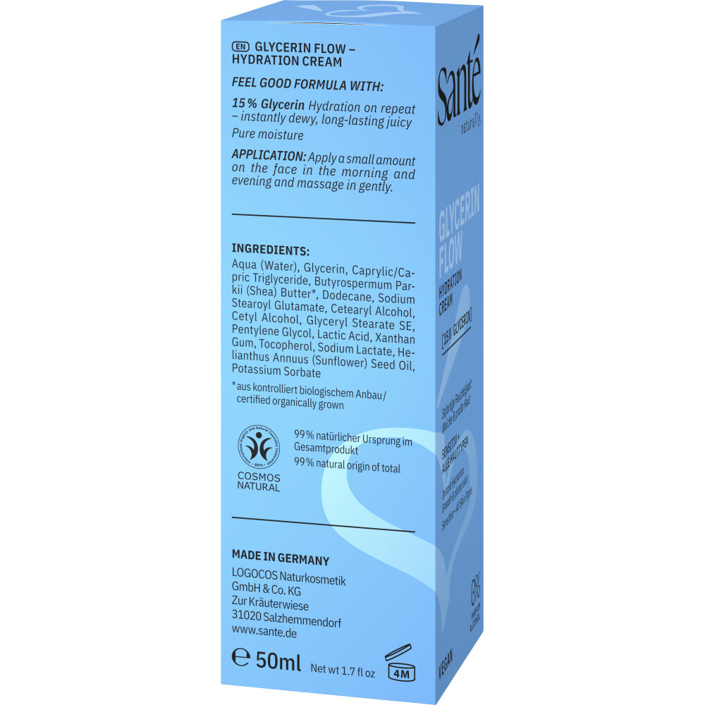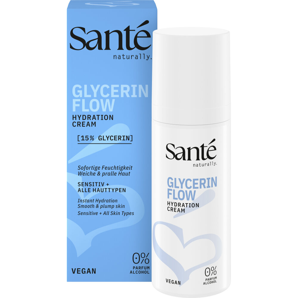 Genieße intensive Pflege mit der Sante Glycerin Flow Cream, die deine Haut mit 15% Glycerin tiefenwirksam mit Feuchtigkeit versorgt. Die reichhaltige, aber leichte Textur stärkt die Hautbarriere und sorgt für ein geschmeidiges Hautgefühl - morgens wie abends.