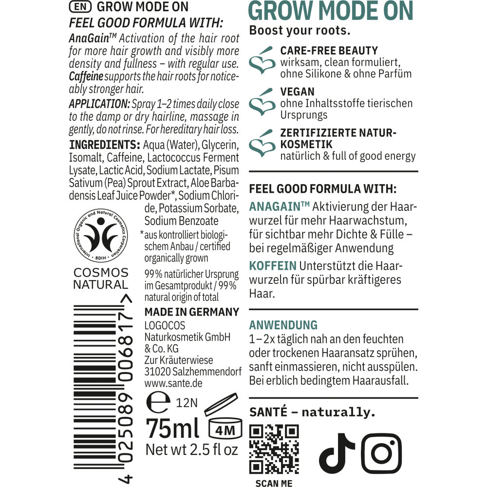 Aktiviere dein Haarwachstum mit dem Sante Grow Mode On Tonikum und gib deiner Kopfhaut neue Energie. Die leichte, alkoholfreie Formel mit AnaGain™ und Koffein wirkt gezielt gegen Haarausfall, stärkt die Haarwurzel und unterstützt ein dichteres, volleres Haarbild. AnaGain™ fördert den natürlichen Wachstumszyklus der Haare, während Koffein die Mikrozirkulation anregt und die Haarfollikel mit wichtigen Nährstoffen versorgt. Glycerin spendet zusätzlich Feuchtigkeit und sorgt für eine ausgeglichene Kopfhaut. Das Tonikum lässt sich mühelos anwenden, zieht schnell ein und beschwert nicht - für vitales, gestärktes Haar vom Ansatz an.