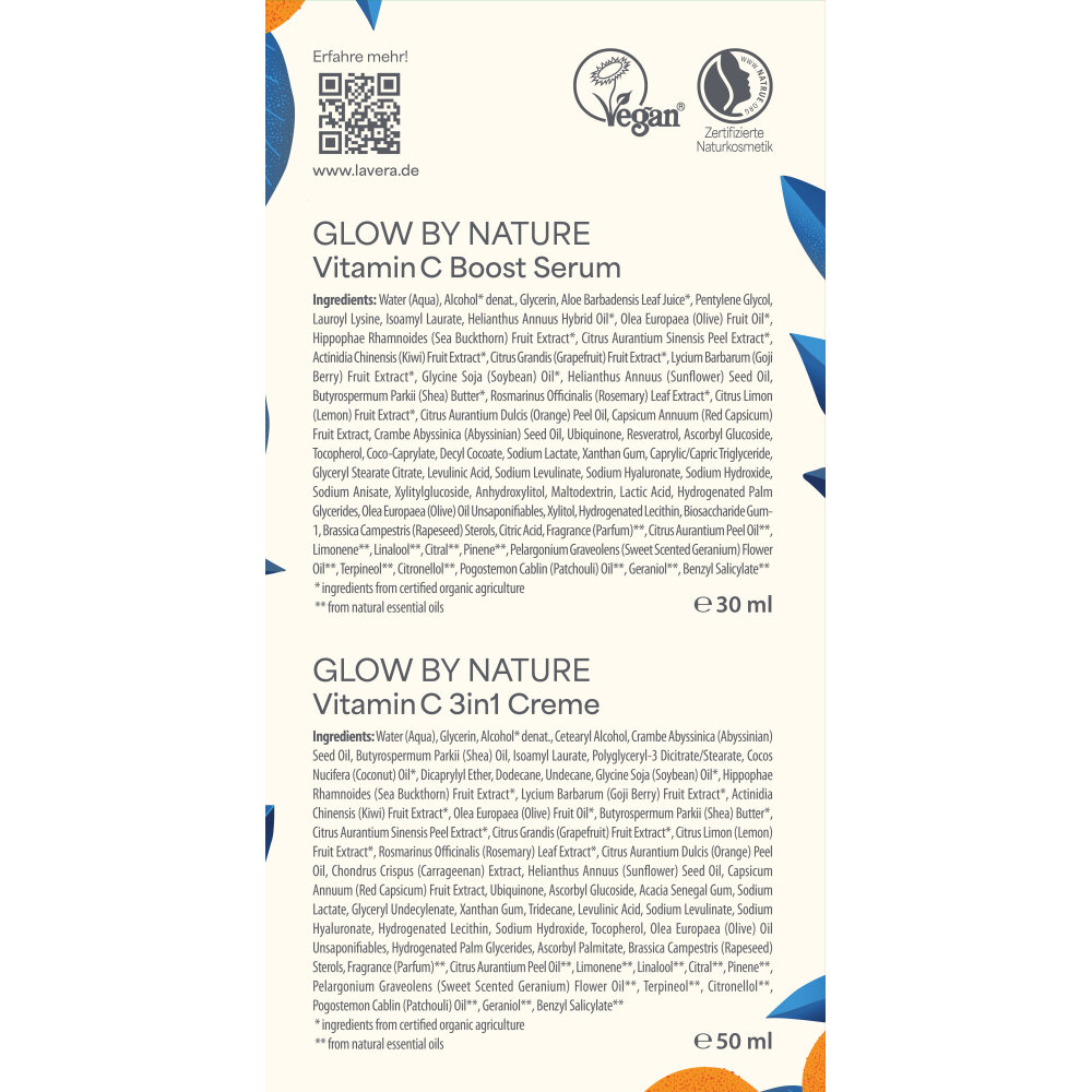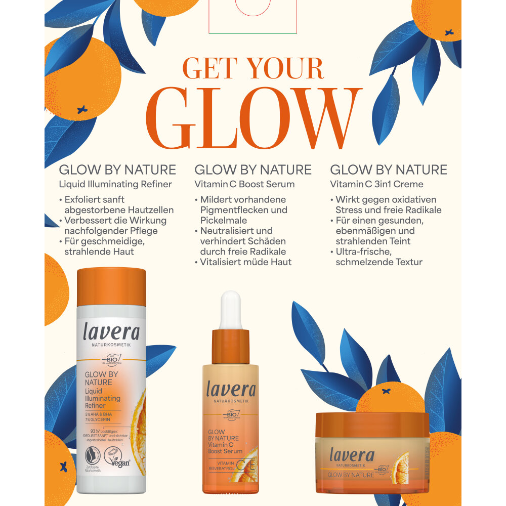 Strahle mit dem Lavera Geschenkset Get Your Glow von innen und außen. Dieses exklusive Set enthält den Liquid Illuminating Refiner, das Vitamin C Boost-Serum und die Vitamin C 3in1 Creme - perfekt abgestimmt für eine natürliche Glow-Routine. Erlebe mit dem Liquid Illuminating Refiner ein sanftes Peeling mit 5 % AHA und BHA sowie 7 % Glycerin. Abgestorbene Hautzellen werden schonend entfernt, während die Haut optimal auf die nachfolgende Pflege vorbereitet wird. Genieße mit dem Vitamin C Boost-Serum eine leichte Textur und vierfache antioxidative Power durch Vitamin C und E, Resveratrol und natürliches Q10. Die Formel schützt vor freien Radikalen, glättet die Haut und sorgt für einen frischen, strahlenden Teint. Freue dich auf die Vitamin C 3in1 Creme, die müde Haut weckt und mit Vitamin C, 2 % Phyto-Kollagen und Q10 gleich dreifach pflegt. Sie stärkt die Hautbarriere, schützt vor vorzeitiger Hautalterung und lässt die Haut sichtbar vitaler wirken. Natürlich schön gepflegt dank 100 % zertifizierter Naturkosmetik, frei von Mineralölen sowie künstlichen Duft- und Konservierungsstoffen. Überzeuge dich von dermatologisch bestätigter Verträglichkeit, nachhaltigen, biologisch abbaubaren Rezepturen und der cleanen Qualität, die deine Haut zum Strahlen bringt. Verwöhne dich oder überrasche jemand Besonderen mit diesem limitierten Geschenkset und starte jeden Tag mit einem gesunden Glow. Fühle die Kraft natürlicher Inhaltsstoffe, die deine Haut sofort erfrischen und sichtbar beleben. Ergänze deine tägliche Pflegeroutine mit dem Lavera Get Your Glow Set - für natürliche Schönheit, die von innen leuchtet. Erlebe pure Ausstrahlung mit einem Hautgefühl, das genauso lebendig ist wie du.