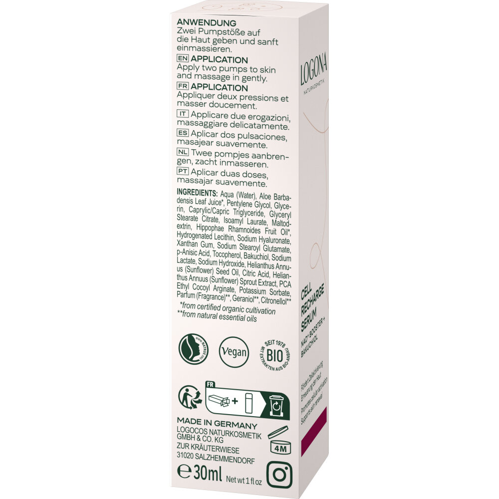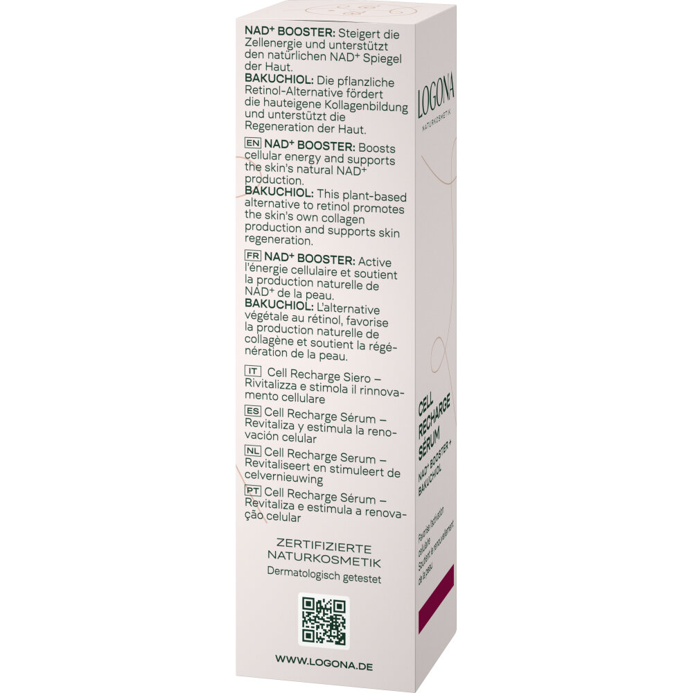 Neuer Energieimpuls für müde Haut: Das Logona Cell Recharge Serum aktiviert die Zellregeneration und stärkt die Haut von innen heraus. Mit RejuveNAD™ als NAD+ Booster und Bakuchiol, der pflanzlichen Retinol-Alternative, unterstützt es die natürliche Erneuerung und Elastizität der Haut. Hyaluronsäure spendet intensive Feuchtigkeit, während Bio-Sanddornöl die Haut mit Nährstoffen versorgt und für ein geschmeidiges, vitales Hautgefühl sorgt. Das Serum kann morgens und abends angewendet werden und begleitet die Regeneration der Haut über Nacht - ideal für ein sichtbar glatteres, erholtes und jugendlicheres Hautbild.