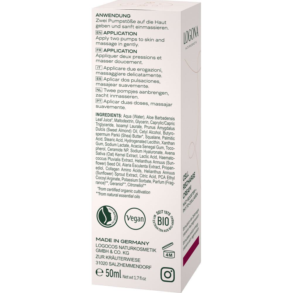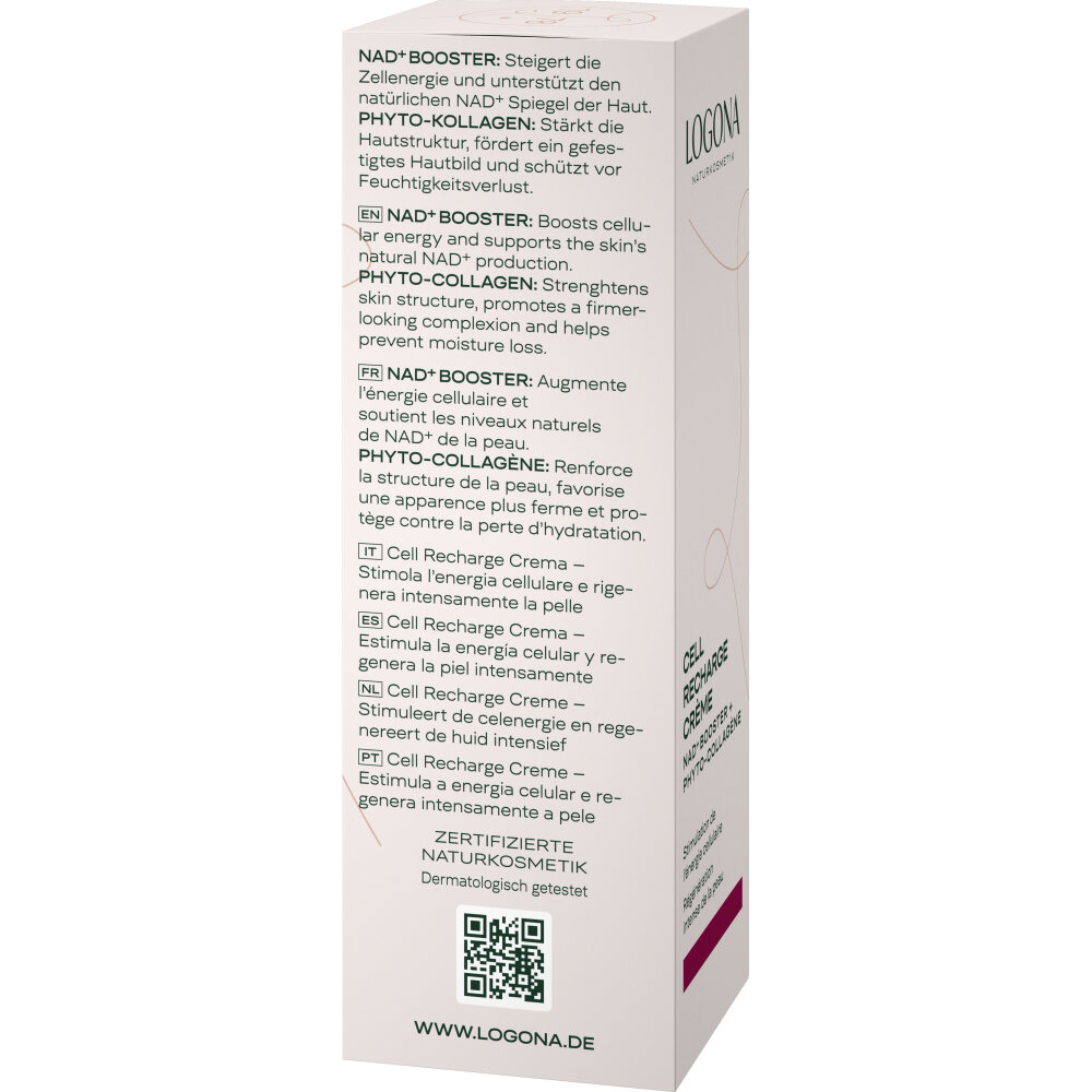 Vitalität und Regeneration vereint die Logona Cell Recharge Cream in einer intensiven Pflegeformel für reifer werdende Haut. RejuveNAD™ aktiviert die Zellenergie, während Phyto-Kollagen die Hautstruktur stärkt und SymCalmin™ aus Hafer beruhigend wirkt. Die Creme unterstützt die natürliche Regeneration, verbessert die Festigkeit und spendet langanhaltende Feuchtigkeit. Studien belegen eine spürbare Verbesserung der Hautgesundheit bei regelmäßiger Anwendung. Dank ihrer reichhaltigen Textur eignet sie sich ideal als Tages- und Nachtpflege und verleiht der Haut neue Geschmeidigkeit, Elastizität und eine sichtbar revitalisierte Ausstrahlung.