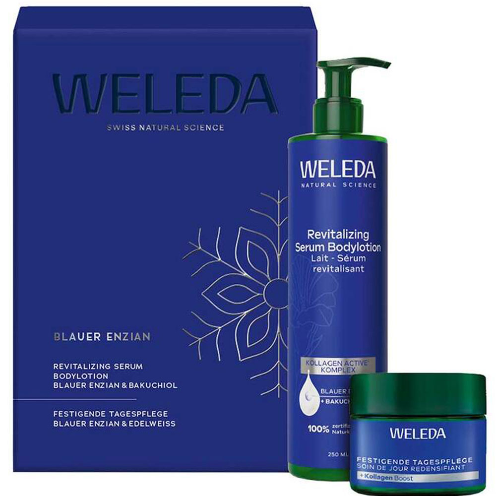 Das WELEDA Geschenkset Blauer Enzian enthält 1 x Festigende Tagespflege Blauer Enzian & Edelweiss 40 ml und 1 x Revitalizing Serum Bodylotion 250 ml. Die einzigartige Wirksamkeit der Festigenden Gesichtspflegelinie gibt es jetzt auch für den Körper. Vereint in diesem Geschenkset kommt die volle Swiss Natural Science Power für eine ganzheitliche Anwendung.